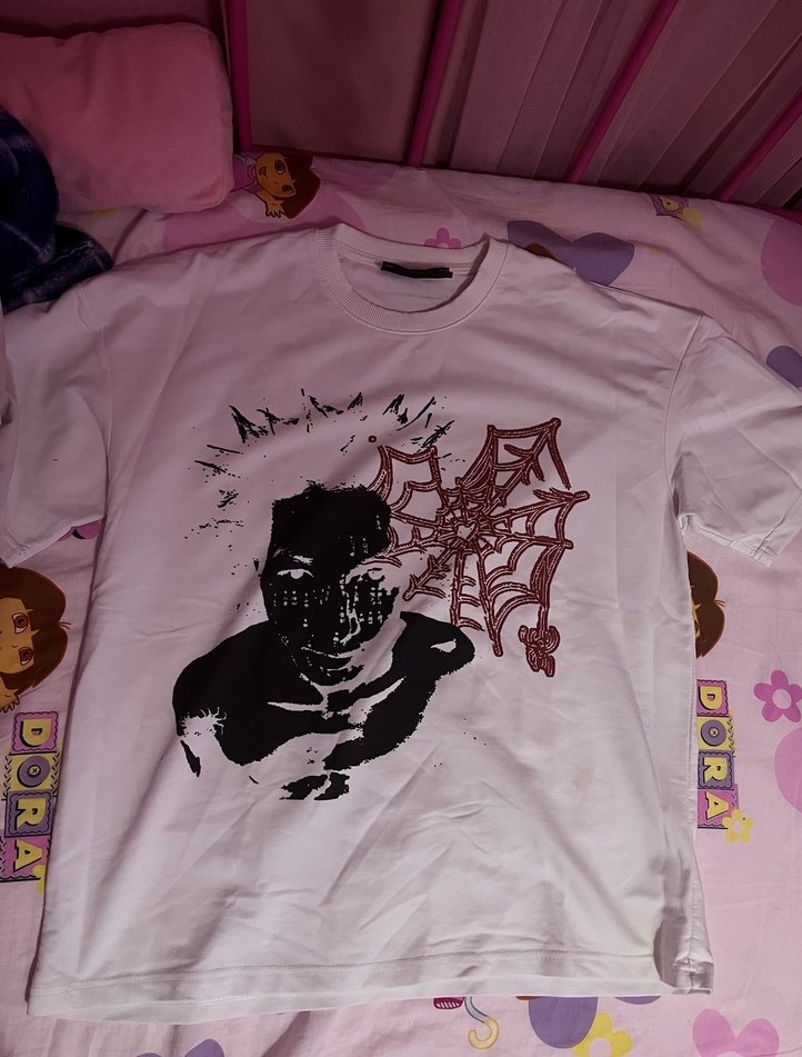 Kısa kollu, yuvarlak yakalı, kalın kumaş ve bol kesim tişört. Beyaz üzerine koyu renkli rock punk temalı baskı bulunur. M beden