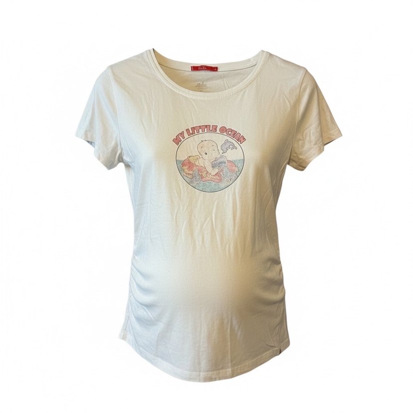 Beyaz pamuklu hamile tişörtü, kısa kollu ve yuvarlak yaka. Bol kesim ve 'My Little Ocean' baskılı tasarımıyla rahat ve günlük kullanıma uygun.