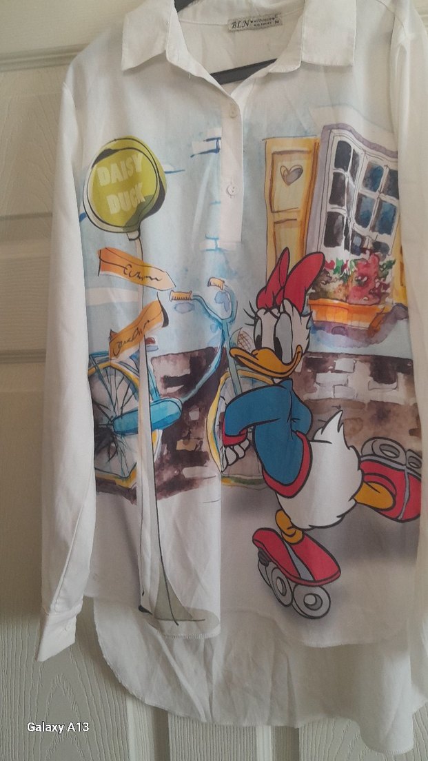 Pamuklu, baskılı ve düğmeli bu çocuk gömleği, uzun kollu ve normal midi boydadır. Gevşek kesimi, pastel renkleri ve Daisy Duck figürüyle bohem, retro Paris tarzını yansıtır. Günlük kullanıma uygundur.