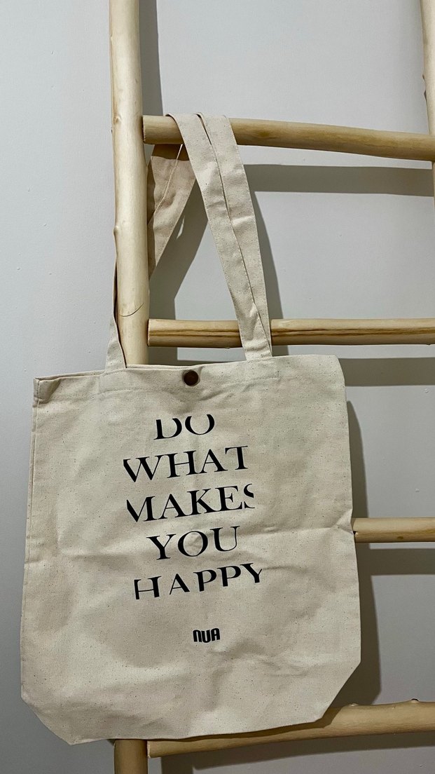 Beyaz pamuklu kadın çantası, baskılı motivasyonel yazıya sahip. Minimalist bohem tarzda, günlük kullanıma uygun sağlam askıları bulunur.