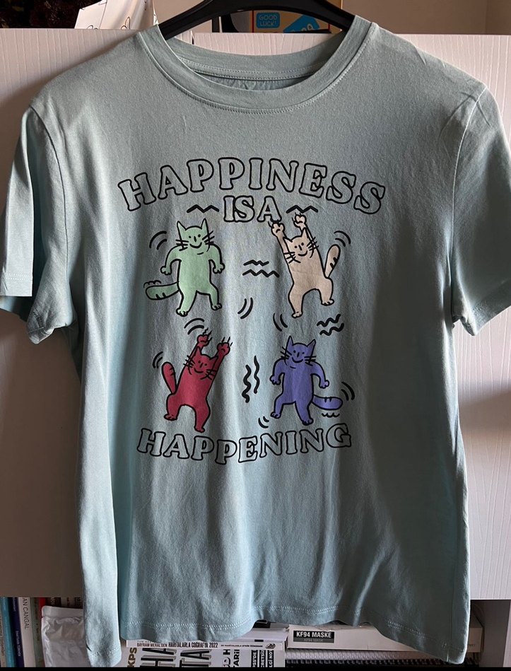 Rahat kesim, pamuklu açık mavi tişört. Üzerinde renkli kediler ve 'Happiness is Happening' yazısı baskılı. Yuvarlak yaka ve kısa kollu.