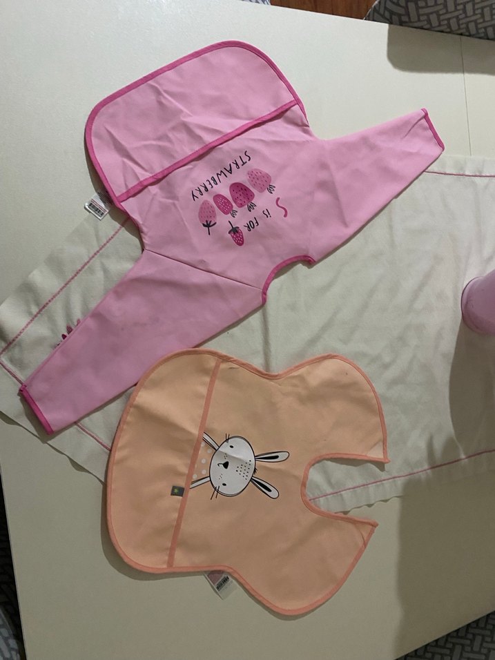 Pastel renklerde, baskılı ve uzun kollu bebek önlükleri. Pembe önlükte çilek deseni, şeftali rengindekinde sevimli tavşan yüzü bulunur.