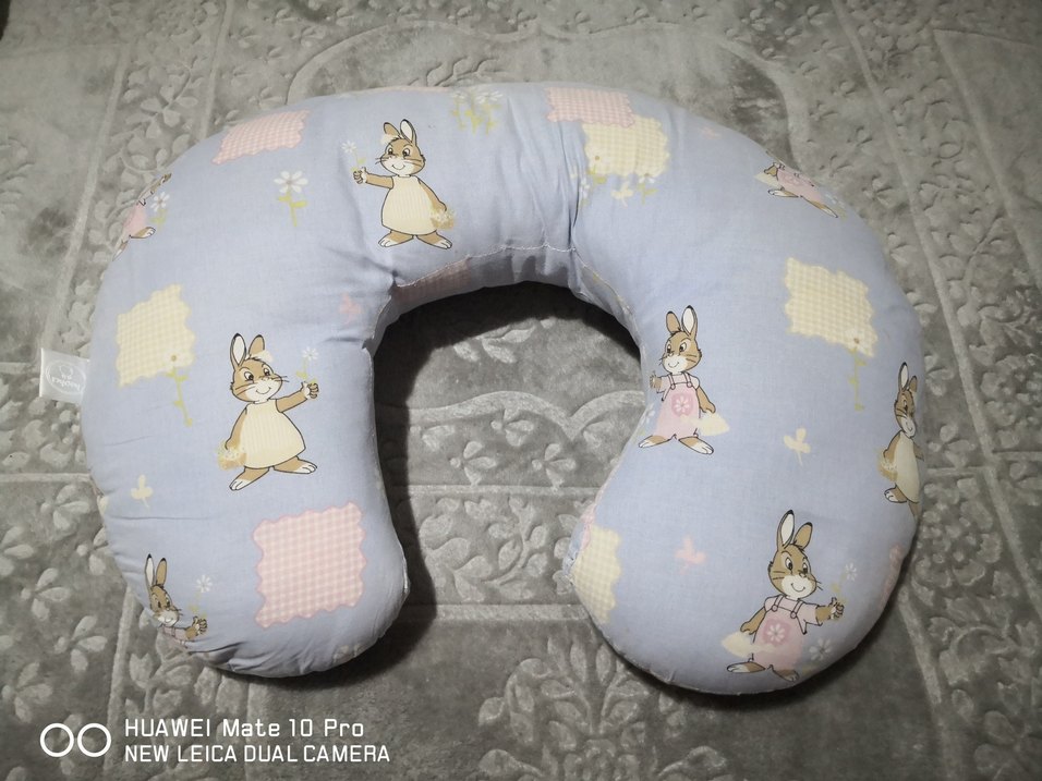 Bej renkli, pastel tonlarda baskılı hamile ve emzirme yastığı. Rahatlık için yumuşak ve destekleyici yapıdadır.