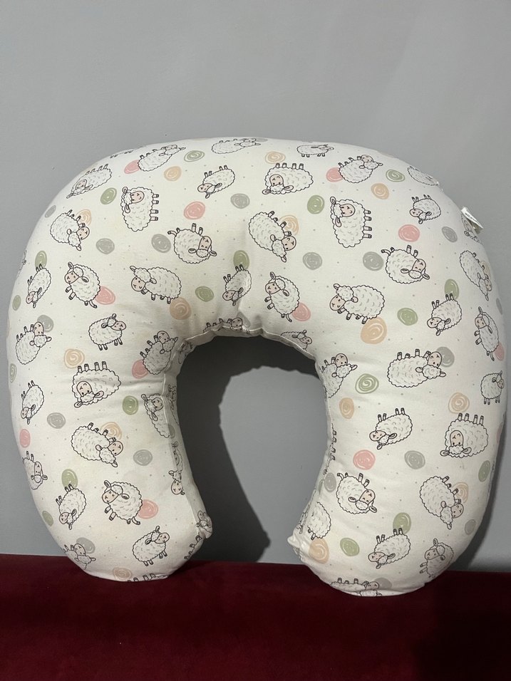 Beyaz zeminde pastel renklerde baskılı, hamilelik ve emzirme sırasında destek sağlayan yumuşak bir yastık.