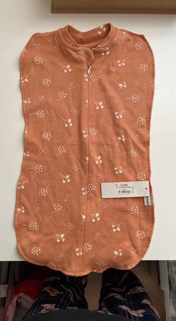 Pastel kahverengi, baskılı çiçek desenli, yumuşak pamuklu kumaştan bebek uyku tulumu