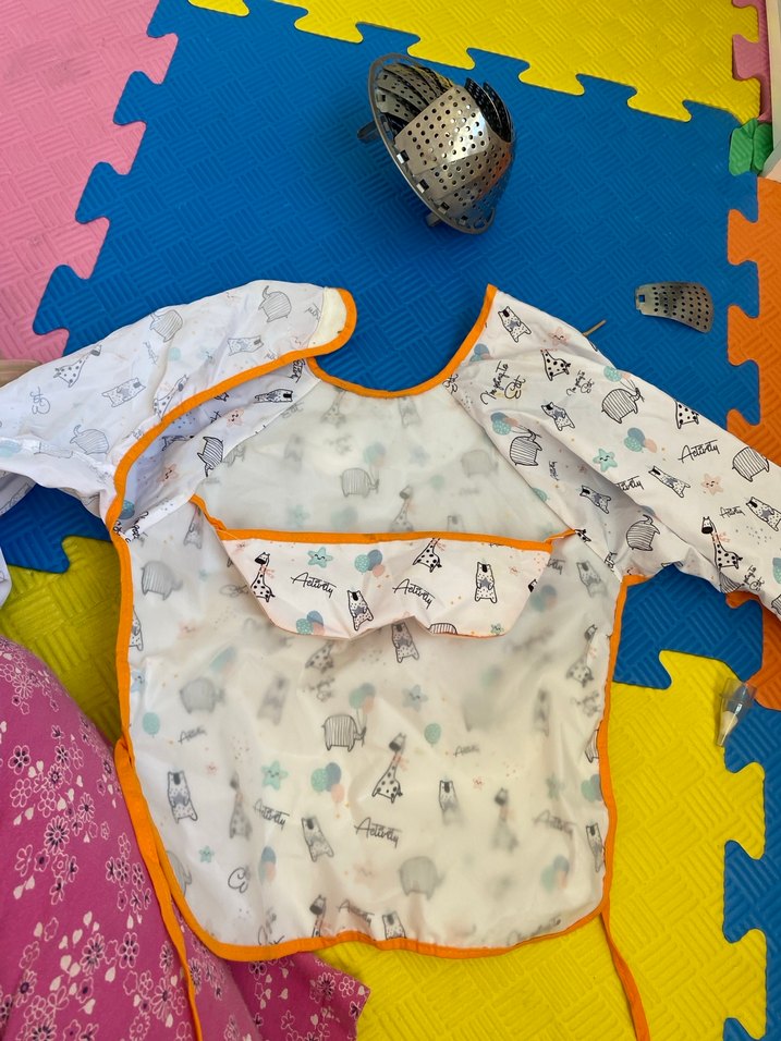 Pastel renklerde, baskılı desenli uzun kollu bebek önlüğü. Turuncu kenarlık ve ön cep bulunur.