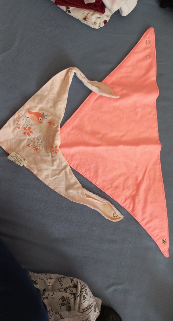 leke kismi mevcut.Pastel pembe renkli, biri baskılı kuş desenli, çıtçıtlı iki adet bebek önlüğü seti. Yumuşak ve konforlu kumaş.
