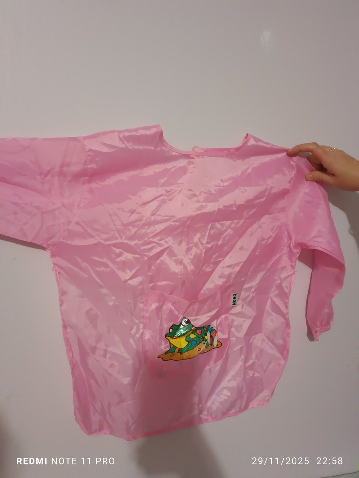 Pastel pembe renkte, baskılı kurbağa desenli, uzun kollu boyama önlüğü.