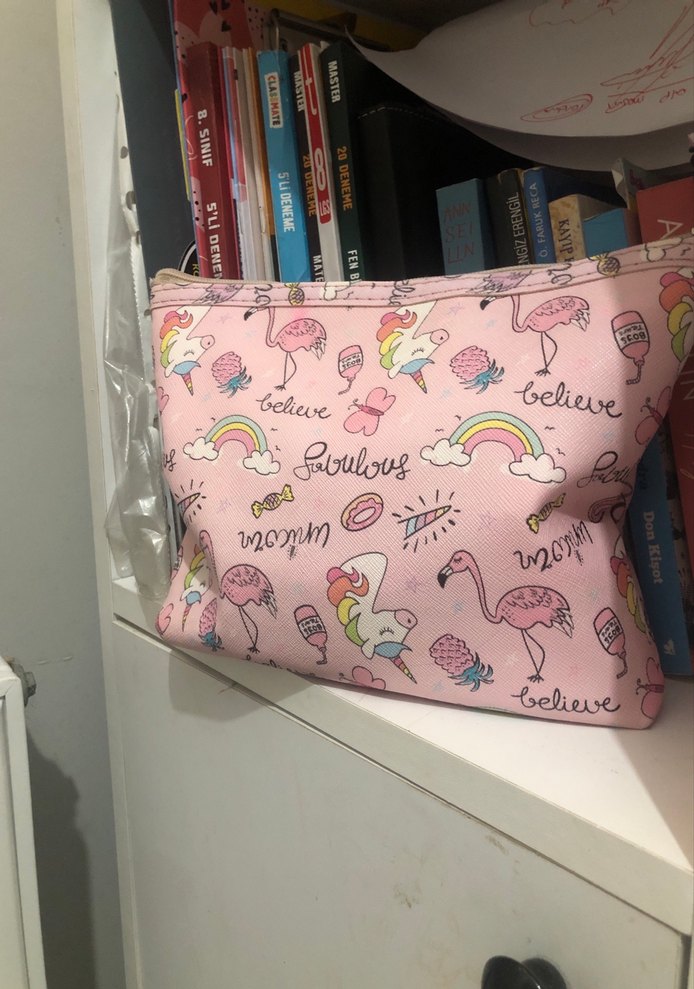 Pastel pembe renkte, fermuarlı ve gökkuşağı, flamingo, unicorn desenli baskılı makyaj çantasıdır.