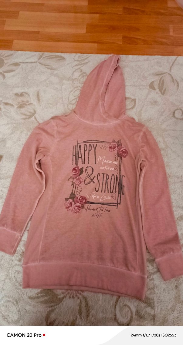 Pembe kapüşonlu sweatshirt, uzun kollu ve bol kesimdir. Baskılı deseni rahat ve şık bir sokak stili sunar.