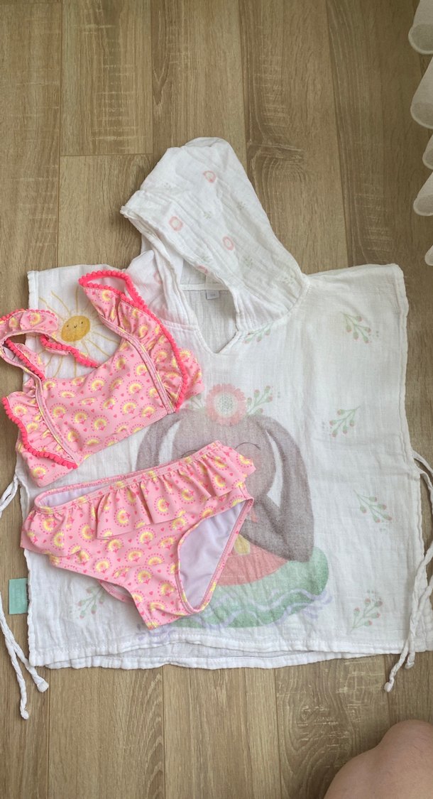 Temiz kullanılabilir durumda 3-4 yaş her iki üründe. Hepsi tek fiyat Müslin panço marka: casadora baby (trendyoldan bakabilirsiniz) Pembe pastel renkli, baskılı ve volan detaylı askılı bikini takımı, bohem tarzda plaj için uygun.