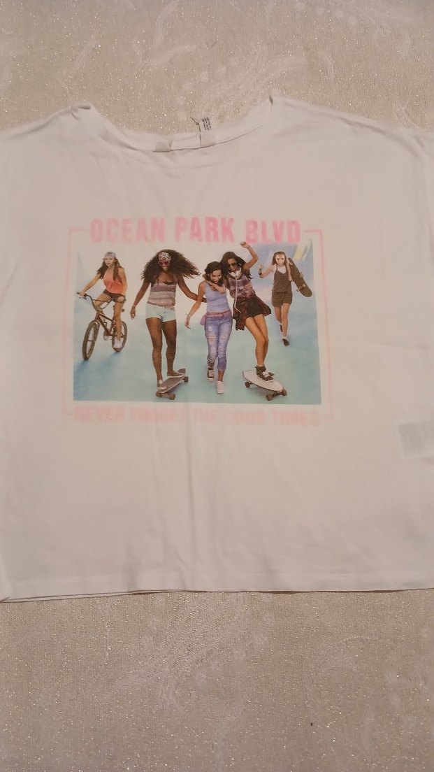 Baskılı, kısa kollu, yuvarlak yaka ve bol kesim pembe kız tişörtü. Üzerinde "OCEANPARK.BLVD" yazılı grafik baskı bulunur. hiç kullanılmadı