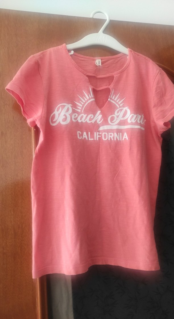 Pembe, kısa kollu kız tişörtü, bol kesim. 'Beach Park California' baskılı, yuvarlak yaka ve kesik detaylı.