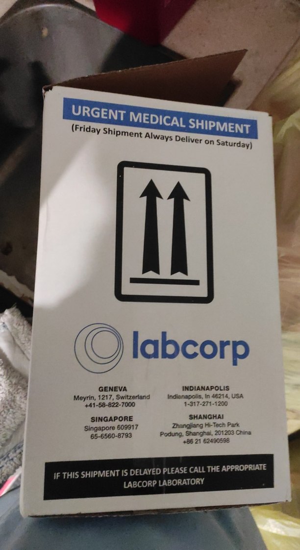 Beyaz renkte, baskılı acil medikal gönderim detayları ve iletişim bilgileri içeren plastik kutu, normal uzunlukta ve rahat kesimdedir.