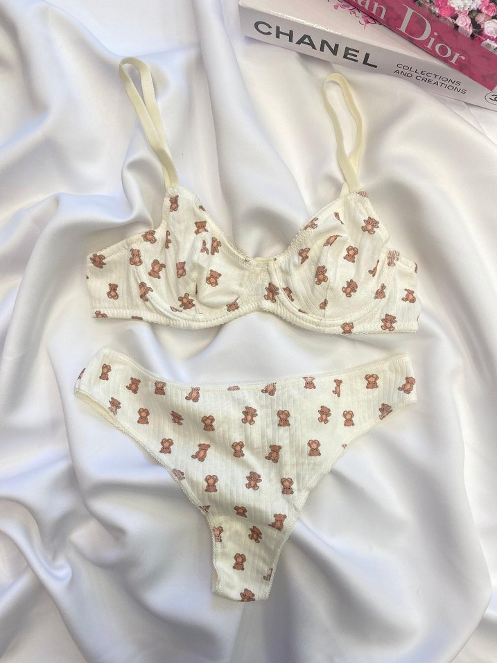 Pastel ayıcık desenli krem sütyen ve külot seti, ayarlanabilir askılar ve normal uzunluk sunar. Rahat ve yumuşak dokulu. 75-80-85-90