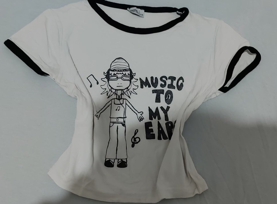 Pamuklu, kısa kollu, yuvarlak yakalı, rahat kesim crop,yazilar biraz solmustur.S-M bedendir