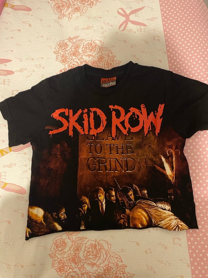 Pamuklu, kısa kollu ve dar kesim kız çocuk tişörtü. Koyu renk ve 'SKID ROW TO THE GRIND' baskılı rock punk tasarım içerir.