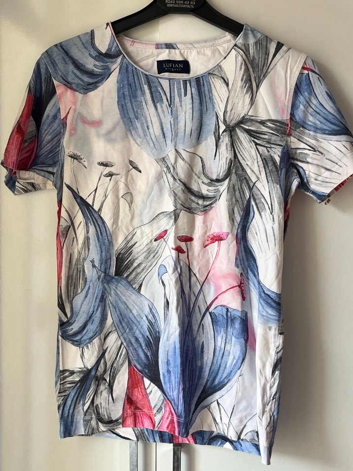 Bu tişört salaş kesim, kısa kollu ve yuvarlak yakalıdır. Drapeli tasarımı ve canlı çok renkli çiçek baskısı ile günlük sokak stiline uygundur.