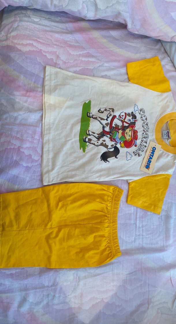 Renkli baskılı çocuk atlet takımı, sarı kollu üst ve şort içerir. Üstte at ve binici deseni bulunur. Rahat ve canlı renklerde.
