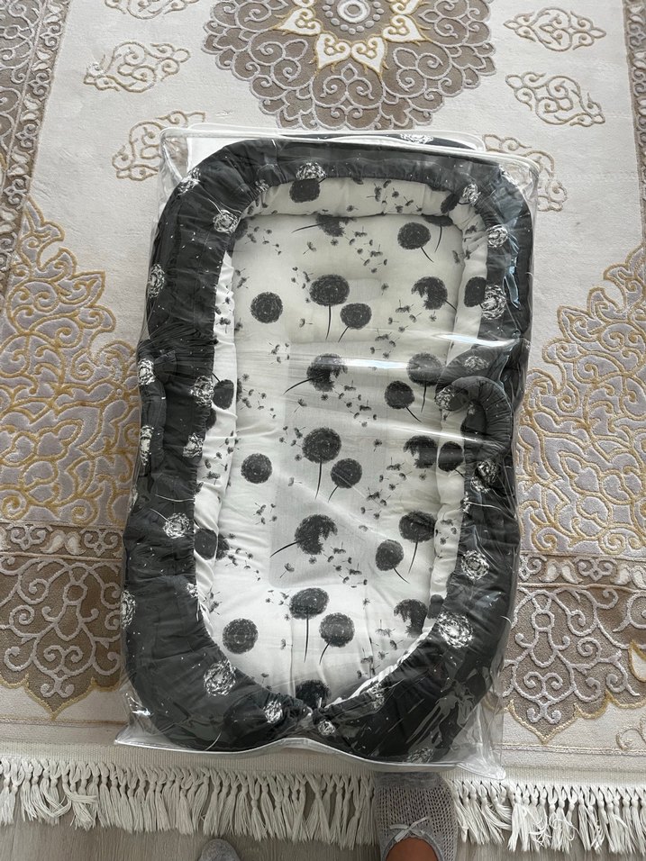 Pamuklu kumaştan yapılmış, baskılı desene sahip siyah bebek uyku yatağı, bebekler için rahat ve güvenli bir dinlenme alanı sunar.