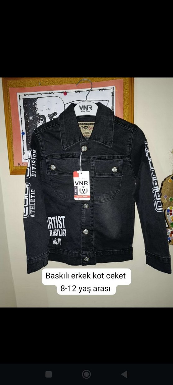 8-12 yaş erkekler için düğmeli, baskılı siyah kot ceket. *LÜTFEN İLANI SATIN ALMAYIN YENİ İLAN AÇTIRIN.