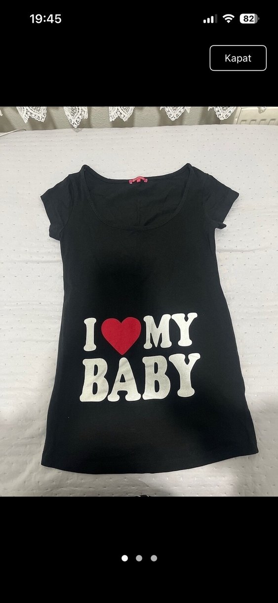 Pamuklu, kısa kollu, bisiklet yaka siyah hamile bluzu. Üzerinde "I ❤️ MY BABY" baskısı bulunur. Günlük ve goth tarzına uygun.