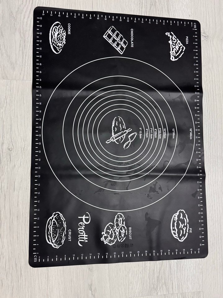 Yiyecek desenleri ve ölçü işaretleriyle baskılı siyah hamur matı mutfak işleri için uygun.