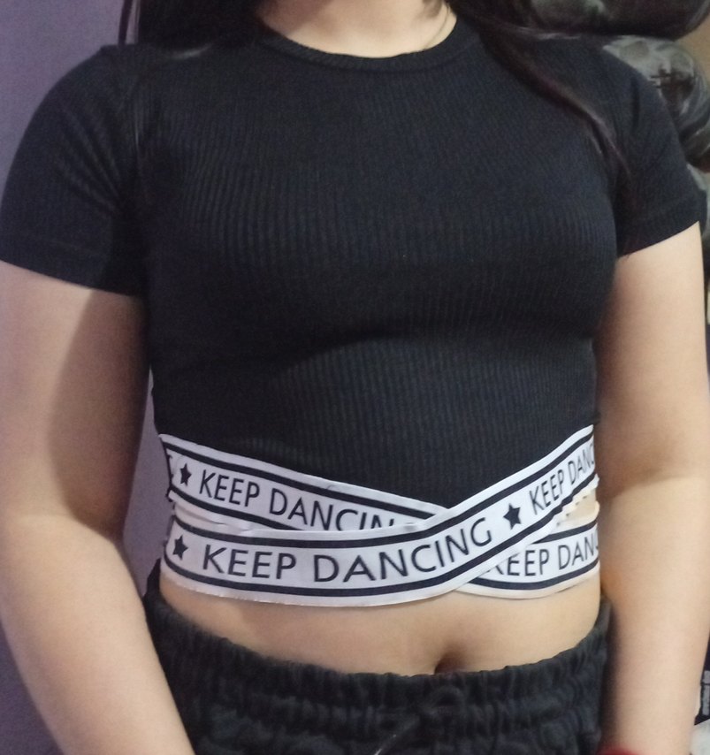 Siyah, vücuda oturan crop top, yuvarlak yaka ve askılı kollu, baskılı kemer detaylı, sentetik kumaştan yapılmıştır.