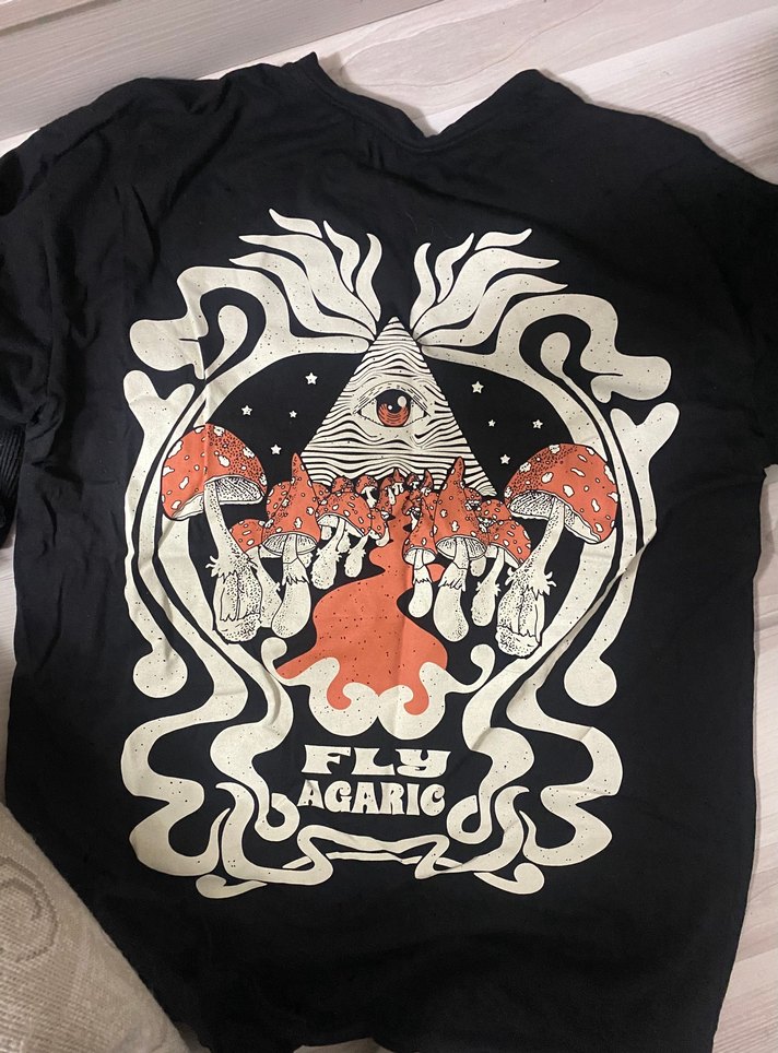 Kısa kollu, bisiklet yaka, bol kesim siyah hamile tişörtü. Psychedelic baskı ve 'AGARIC' yazısı içerir. Sokak modası ve partiler için uygun.