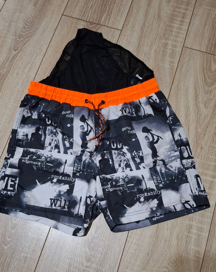 Baskılı siyah beyaz desenli, turuncu kemerli, bol kesim erkek deniz şortu, plaj için uygun.