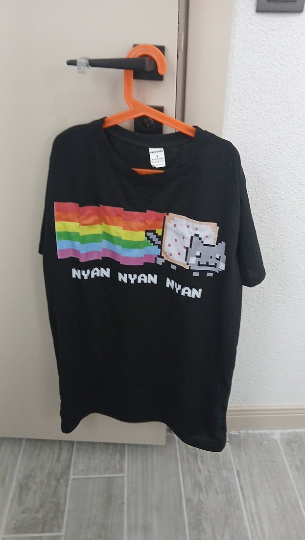 Siyah nyah cat tişörtü, kısa kollu ve renkli baskılı piksel sanatlı kedi deseniyle. Rahat kesim ve yuvarlak yaka.