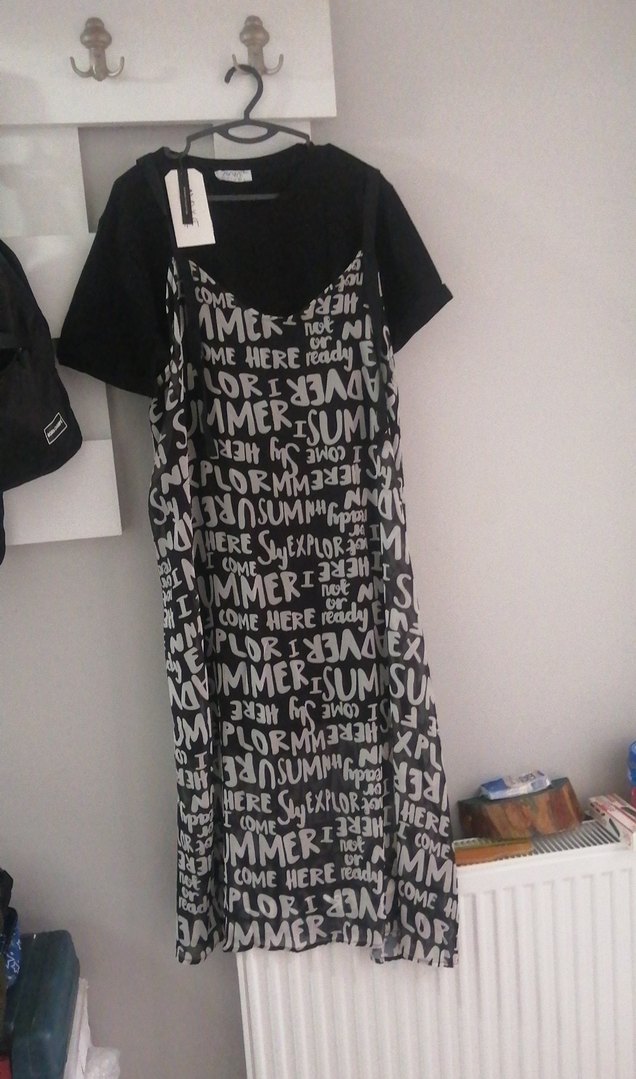 Sokak stiline uygun, straplez yakalı ve dökümlü tekstil kumaştan yapılmış, bol kesim siyah ve gri baskılı uzun hamile elbisesi.