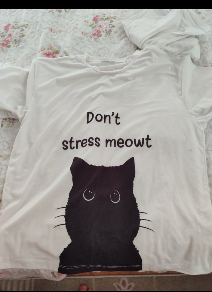 Beyaz renkte, üzerinde siyah kedi ve 'Don't stress meowt' yazısı bulunan baskılı sokak stili kedi kıyafeti. 3 tane tişirt
