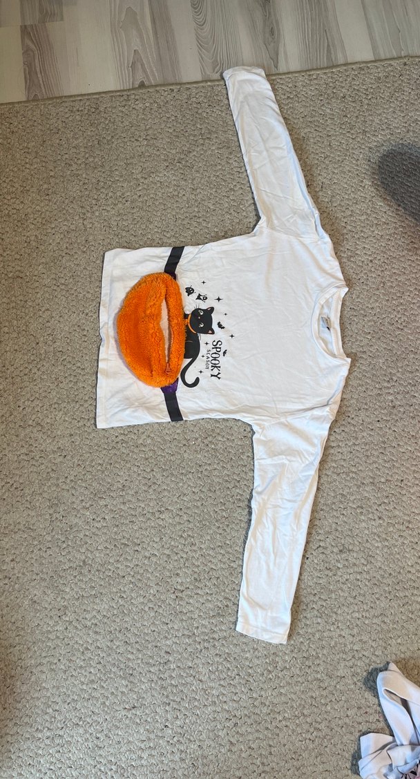 Baskılı siyah kedi deseni ve turuncu fermuarlı cep detaylı beyaz sokak stili kedili tişört. Rahat ve eğlenceli tasarım .