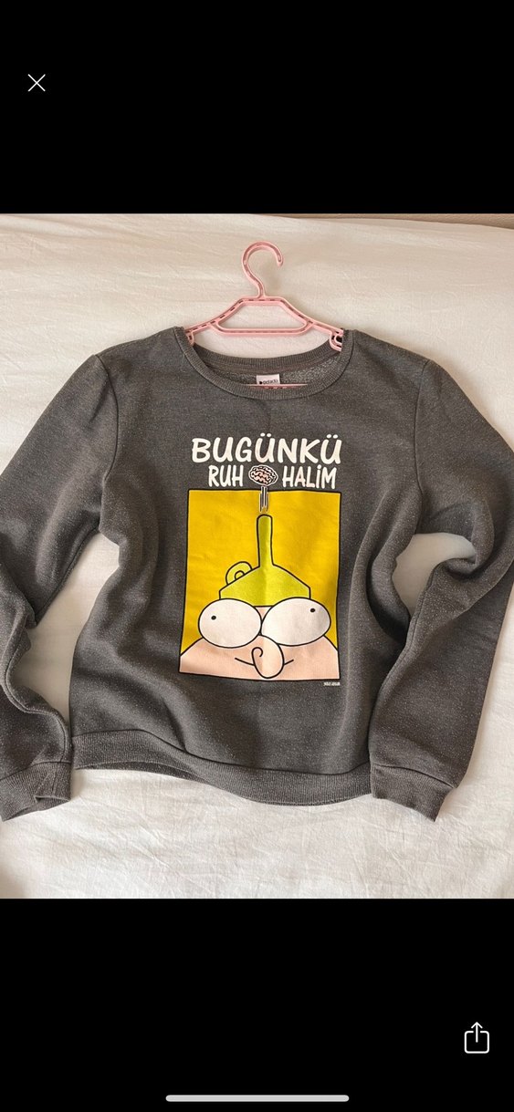 Gri renkli, yuvarlak yaka ve uzun kollu sweatshirtü. Rahat kesimli, yumuşak ve örme dokulu kumaştan. Önünde 'BUGÜNKÜ RUHHALİM' yazılı renkli baskı bulunur. Sokak tarzı için uygun.