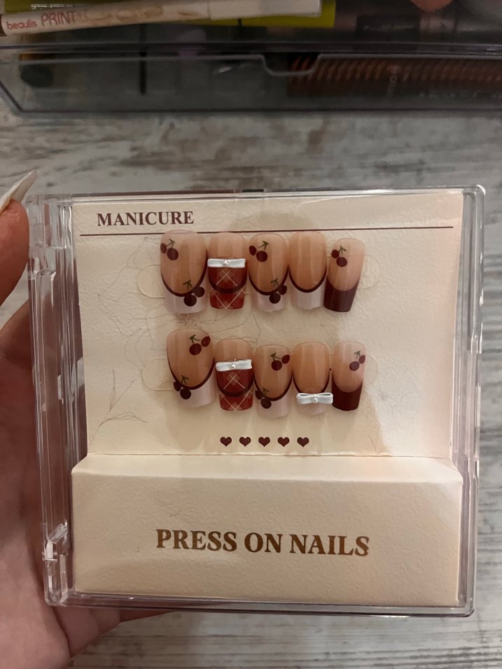 kiraz ve fiyonk desenli, kolay uygulanan takma tırnak seti