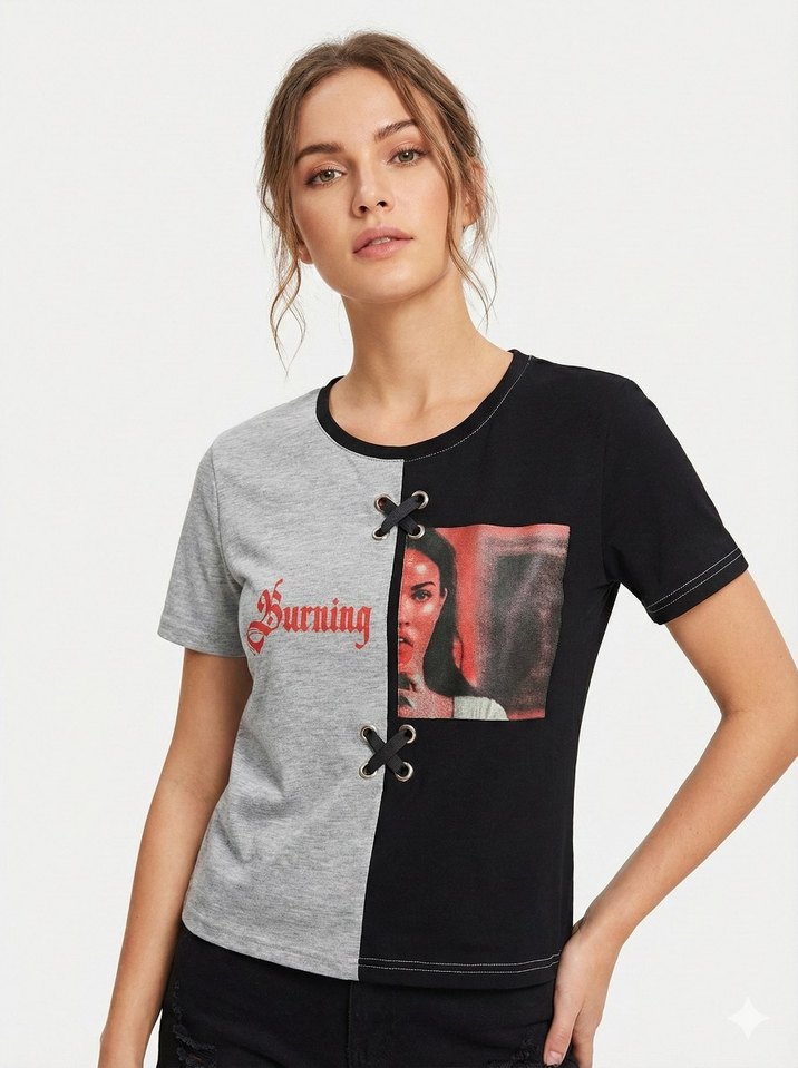 Kısa kollu, yuvarlak yakalı, düğmeli detaylı gri siyah renk bloklu baskılı kız tişörtü. Yumuşak pamuk kumaştan, rahat kesim. Carpe Butik den aldım hiç kullanmadım kombinleyemedim. Bana geldiğinde de ortasında iplik açılması vardı fotoğrafda göründüğü üzere lakin iç göstermiyor. Ürün croptur S bedendir.