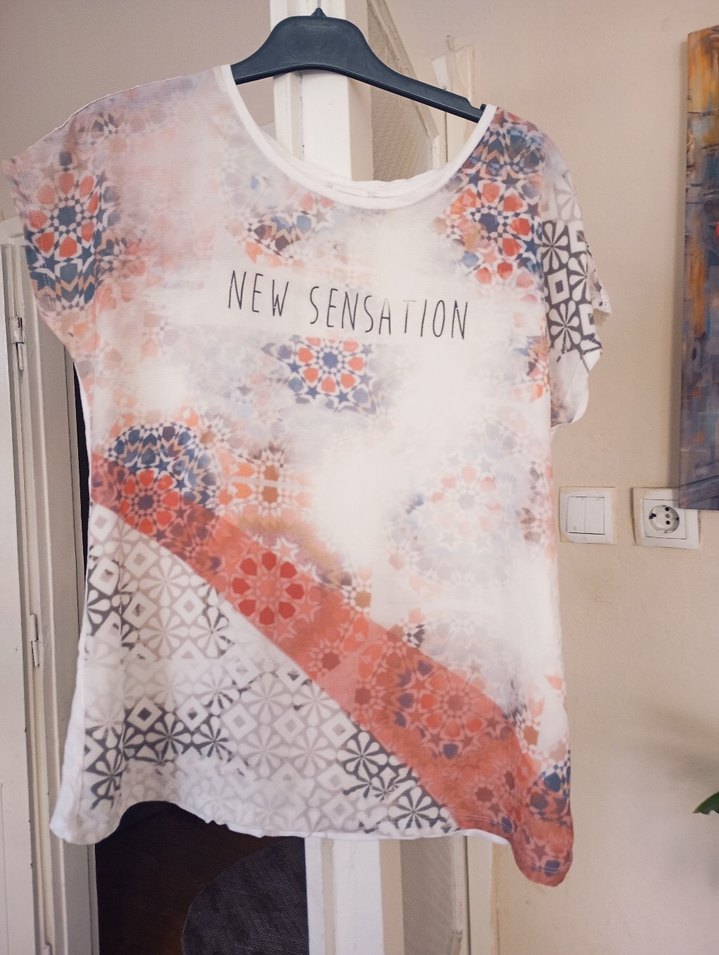 Baskılı, kısa kollu, yuvarlak yakalı, transparan sentetik kumaştan yapılmış, bol kesim hamile tişörtü. Üzerinde "NEW SENSATION" yazısı bulunur.