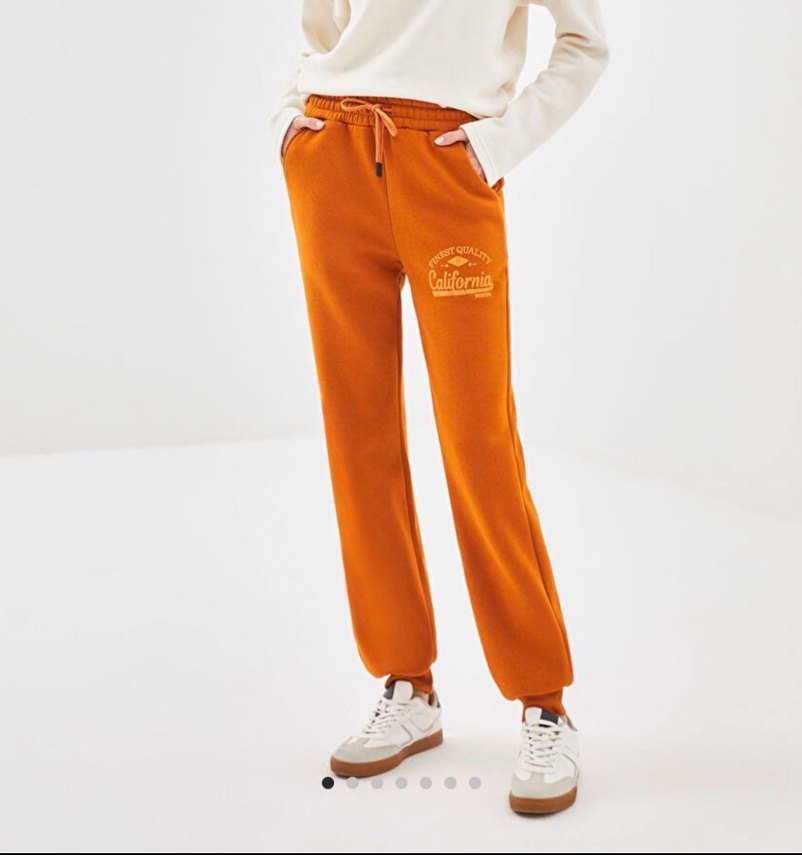 Yumuşak ve sıcak kumaştan üretilmiş, kemerli ve baskılı, parlak turuncu renkli, bol kesim midi eşofman altı. Günlük kullanım için uygundur.