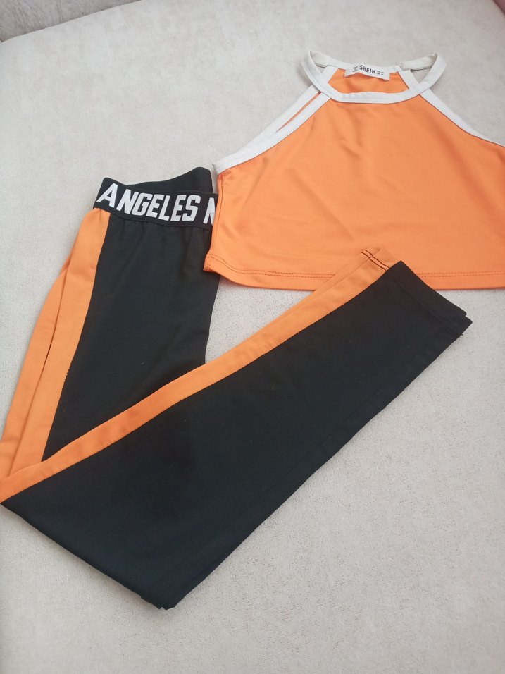 Siyah ve turuncu renkli, baskılı 'ANGELES' yazılı bel bantlı, midi uzunlukta dar kesim tayt. Beyaz detaylı, askısız ve kolsuz turuncu crop top ile kombinlenmiştir. ♀️