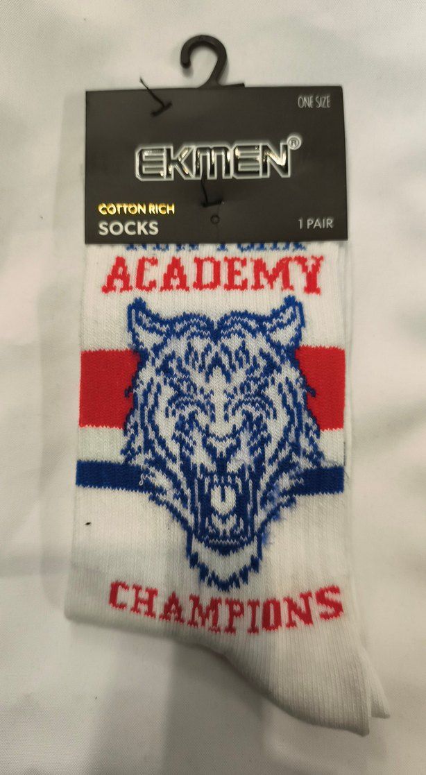 Pamuk zengin dokulu, beyaz ve gri baskılı çorab. Kurt deseni ve yazı bulunur. Tek beden, 1 çift.