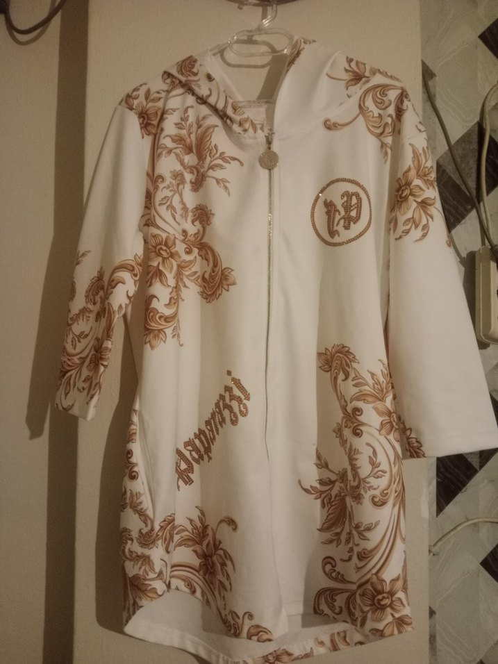 Baskılı, uzun, bol kesim kadın elbise kısa kollu ve parlak beyaz zemin üzerine kahverengi desenlerle Paris sokak modası tarzında. Fermuarlı ve kapşonludur. Takim