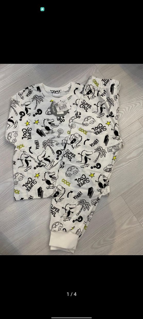 Beyaz ve gri baskılı, uzun kollu ve bisiklet yaka bebek erkek takımı, yumuşak sentetik kumaştan üretilmiştir. Sokak stili baskılar içerir.
