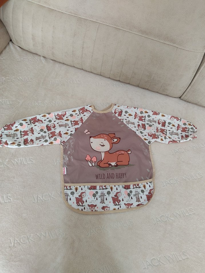 Uzun kollu, kahverengi ön yüzünde geyik ve "WILD AND HAPPY" yazısı bulunan baskılı bebek önlüğü. Kolları ve alt kısmı gri zemin üzerinde hayvan desenlidir. Etkinlik ve mama önlüğü olarak kullanılabilir.Çok yenidir.