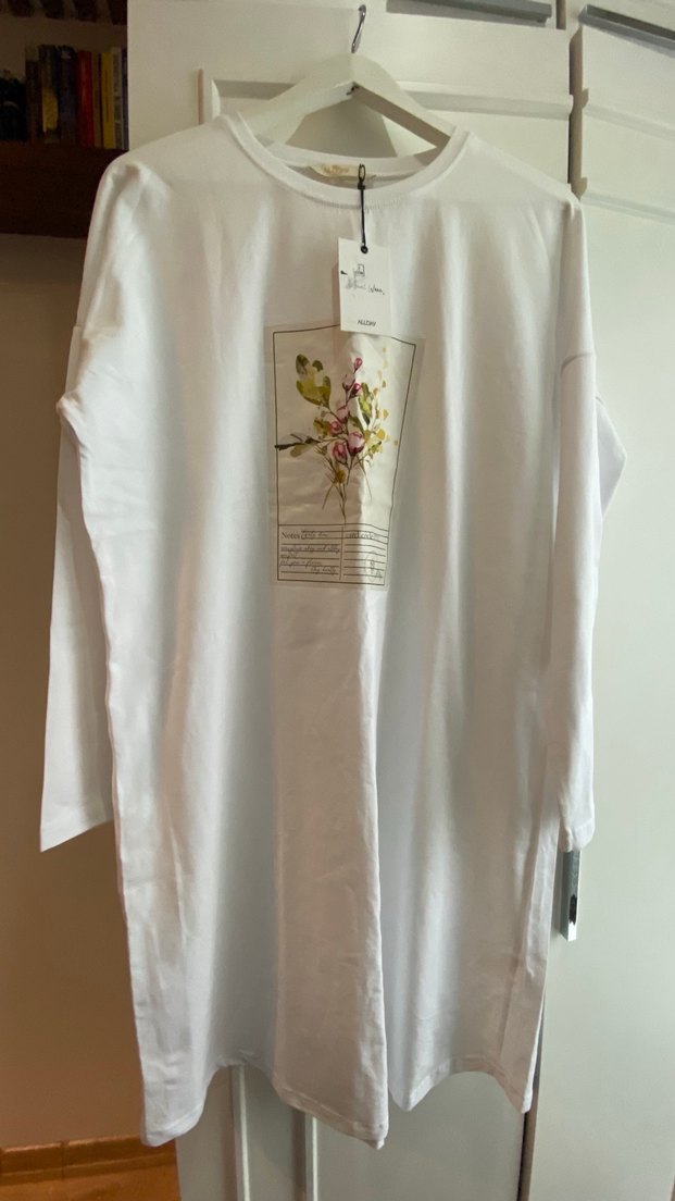 Yumuşak pamuklu penye kumaştır bol kesimdir. 42-44 beden uyumludur Önündeki baskıda çok hafif bir eğrilik var detaylı bakılmadıkça anlaşılmıyor, ben alırken farketmedim, mağazadakiler de uyarmadı hiç. günlük kullanıma uygundur. İki kol arası 62, basen 62, boy 100 cm. İster elbise ister tunik ister iç elbise olarak kullanılabilir