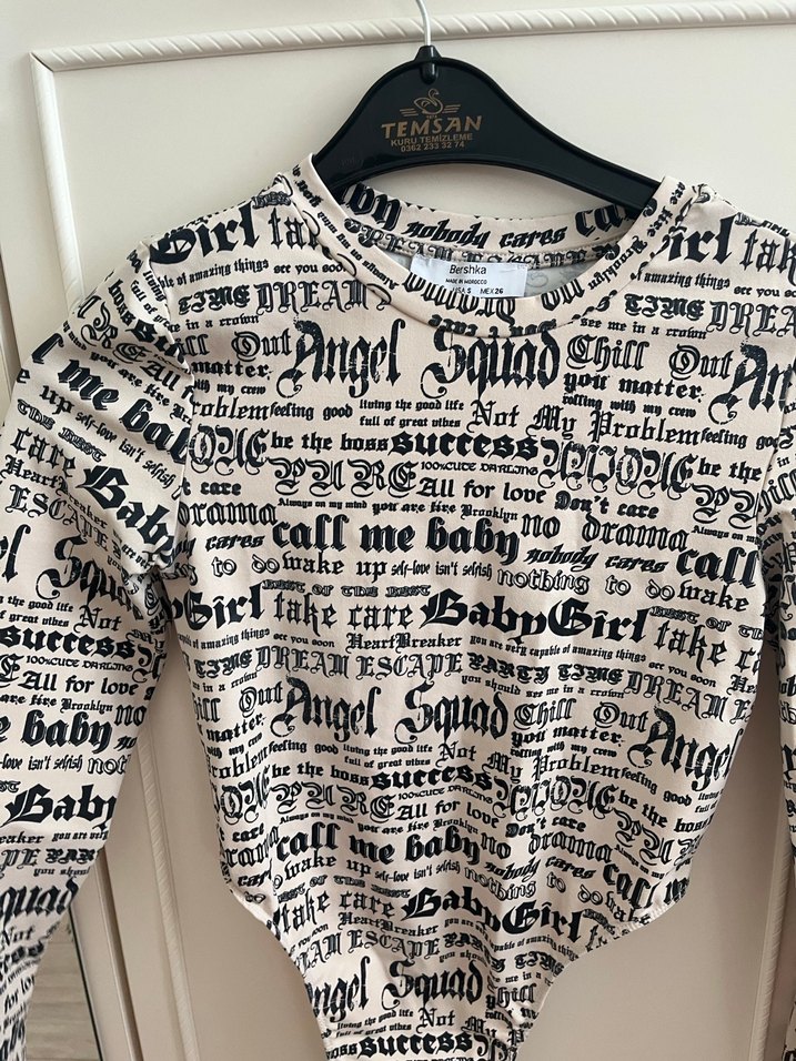 uzun kollu ve bisiklet yakalı, baskılı ve Paris tarzı yazılarla süslenmiş rahat sokak giyim tarzı yeni sayılır 1 defa kullanılmış tır