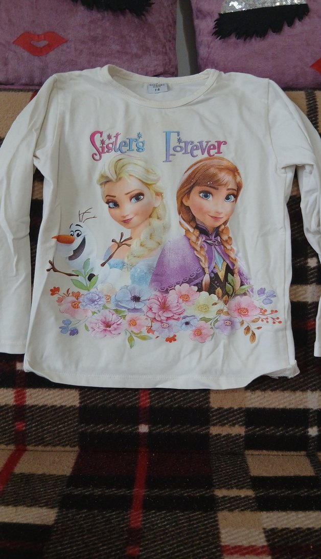 Pamuklu, beyaz, uzun kollu ve bol kesim kız çocuk tişörtü. Önünde renkli baskılı animasyon karakterleri ve çiçekler bulunur. "Sisters Forever" yazılıdır.