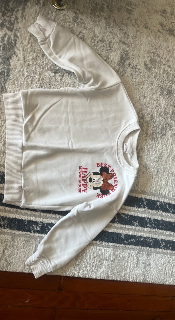 Beyaz, uzun kollu, bisiklet yaka kız sweatshirtü. "HAMPY" yazılı baskı ve örgü dokusuyla rahat kullanım sağlar.