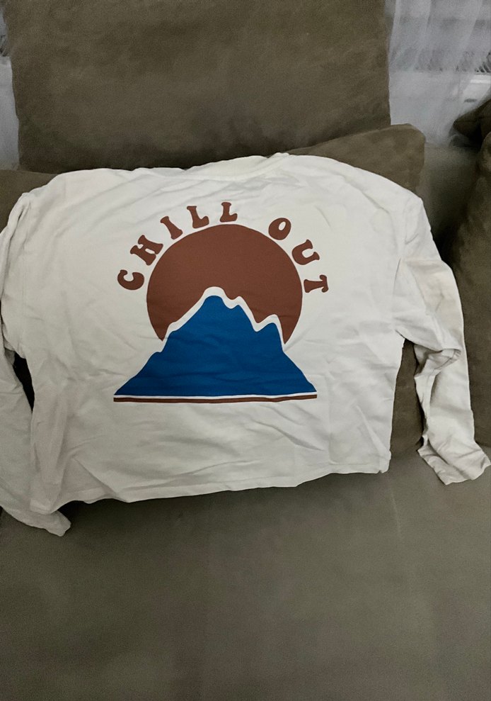 Beyaz renkli, uzun kollu ve yuvarlak yakalı pamuk tişörtü. Gevşek kesim, baskılı dağ deseni ve "CHILL OUT" yazısı içerir, rahat ve günlük kullanıma uygun.