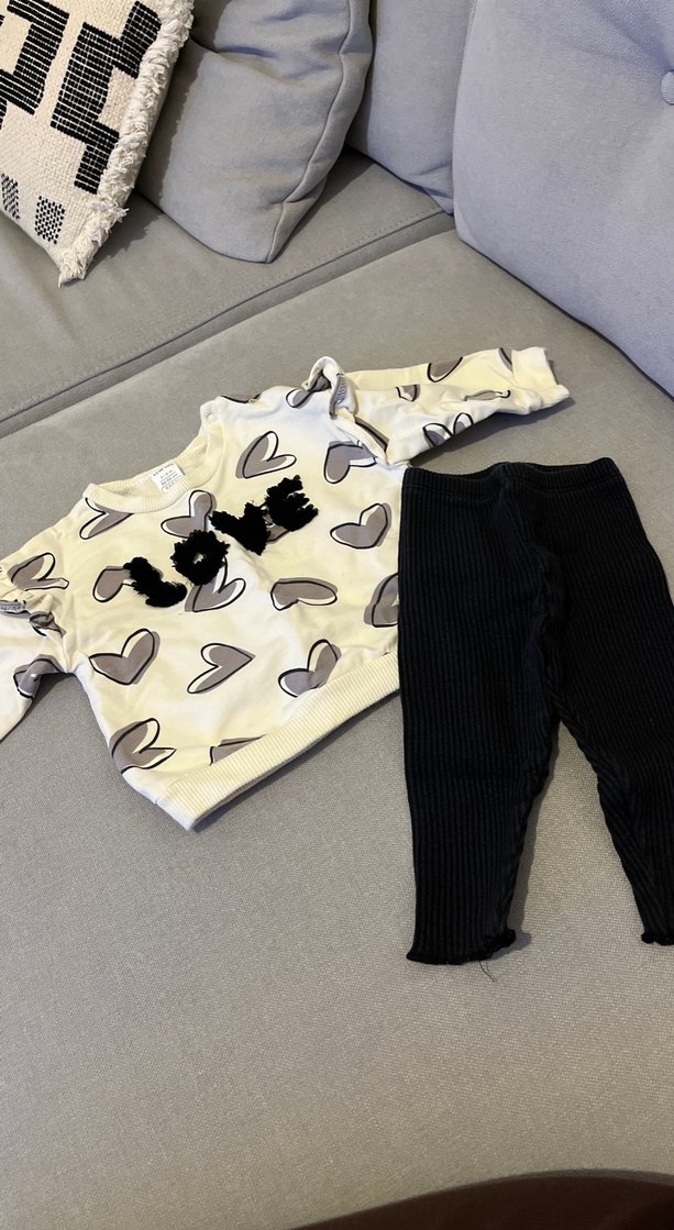 Beyaz ve gri kalp desenli uzun kollu triko üst ile siyah örgü pantolonlu kız bebek takımı.